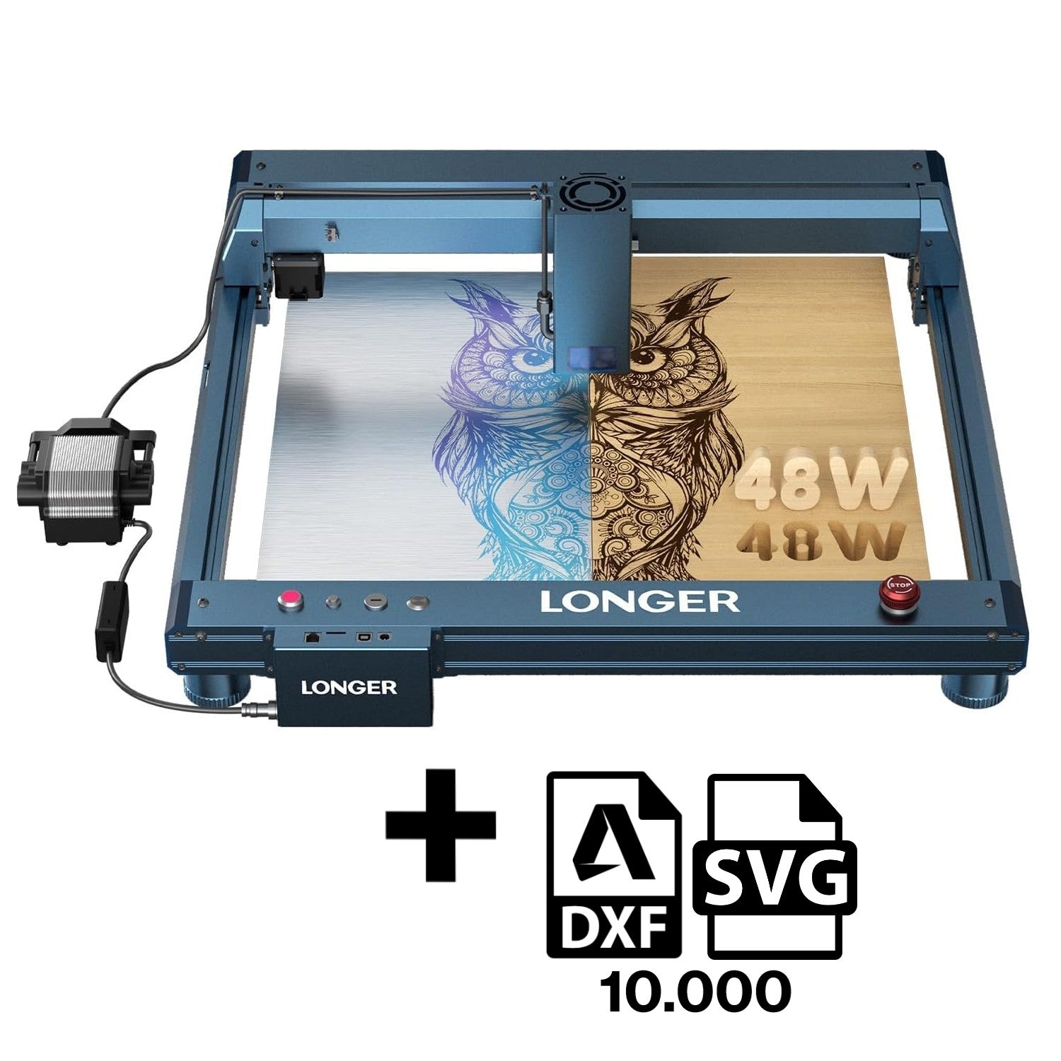 Laser B1 z močjo laserja 44–48 W in zmogljivimi zmogljivostmi rezanja in graviranja lahko reže ali gravira do 1000+ materialov, kot so les, nerjavno jeklo, usnje, srebro, akril (prozornega ne more rezati, lahko pa nanj gravira), blago in več.